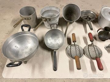 Antichi Utensili da Cucina in ordine da sinistra verso destra: - Secchio pentola con manico in ottone, D: 16, A: 18 cm, 10 euro - 2 Scolapasta a secchio con manico in ottone, D: 18-20, A: 18-18, 10 euro di tutti - Passaverdura, passapomodoro Moulin Legumes brevetto 1 made in France, primo brevetto prodotto in Francia nel 1935, presente in Europa dagli anni 40 e 50, completo di manovella, A: 8, L tot. 33, D: 19 cm, 20 euro - Pentola per pesce pesciera in alluminio, 36x20 A: 12 cm, 10 euro - 2 Scolapasta classico, D: 26 - 18, A: 16 - 8 cm, 15 euro di due - Schiaccia passatelli romagnoli e patate con manico di legno, L: 35, D: 15 cm, 15 euro cadauno - Piccola caraffa caffettiera in rame con qualche ammaccatura, A: 14, L: 10 cm 5 euro - Portacandela in rame lavorato, D: 14.5, A: 10 cm, 15 euro - Mestolo colapasta ruggine da appendere, 45xD14 cm, 5 euro - Piccolo pentolino in alluminio, A: 7, D: 7.5 cm, 5 euro - 5 piccoli utensili in basso a destra, 10 euro di tutti - scola verdure da lavandino, D: 24 cm, 5 euro - piccolo secchio riproduzione secchio del pozzo, 16x18 cm, 5 euro * Pentole, paiolo, scolapaste, passaverdure, schiacciapatate, posate, rustico, agriturismo, taverna, parete, antichi mestieri, civiltà contadina ecc. Condizioni vintage vedi foto