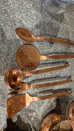 Vendo splendido set di utensili da cucina in rame massiccio, composto da mestolo, schiumarola, paletta forata e cucchiaio grande.