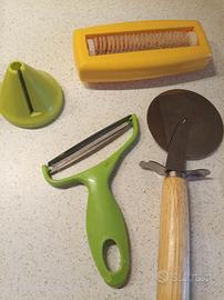 N. 7 utensili utensili per cucina usati pochissimo: un trita verdure alla julienne, un pela ortaggi, un taglia pizza, uno scola legumi ed un raccogli briciole. In aggiunta anche uno schiaccia aglio.