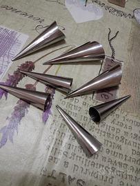 7 coni da pasticceria dolce e salata in alluminio di 2 misure diverse , vendo 3 euro . .... 1 stampo in silicone nuovo mai usato per ciambelline vendo 3 uro .