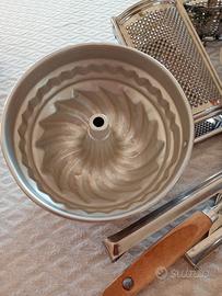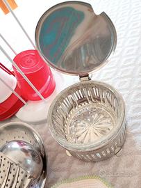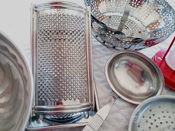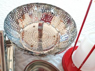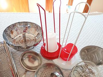 🔹🔹 Il Lotto comprende: ~~ 1 cestello cuoci verdure pieghevole ~~ 1 formaggiera con contenitore in vetro estraibile ~~ 1 stampo in alluminio - diametro 17 h.8 ~~ 1 grattugia richiudibile ~~ 2 dispenser in metallo per bicchieri ~~ 4 utensili per cucinare ~~ 2 presine all'uncinetto Nuove 💢💢 Tutto in ottimo stato, assenza di ruggine 💢💢