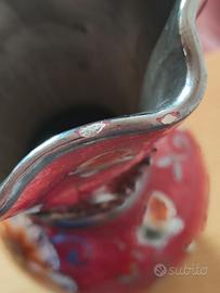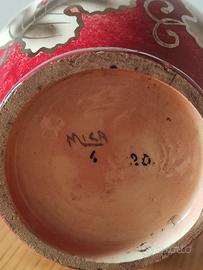 Sul fondo del vaso c'è un marchio dipinto a mano che recita MISA e il numero 20. Il marchio Misa è un'abbreviazione comunemente associata alla manifattura di ceramiche di Sarreguemines località situata in Lorena. Francia rinomata per le ceramiche. Misure: altezza 22, diametro apertura 13 cm, diametro base cm 8. ATTENZIONE ho fotografato delle anomalie sull'apertura superiore dove due tre punti sono leggermente scrostati.