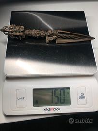 Vajra / Phurba ornamentale in metallo – 3 facciate – 17 cm – 150g Phurba rituale ornamentale ispirato alla tradizione tibetana/himalayana, realizzato in metallo con finitura effetto antico. Impugnatura con volto centrale e motivi simbolici in rilievo. Vajra a tre facciate, non affilata (oggetto esclusivamente decorativo). Solido e ben proporzionato, con una presenza più importante rispetto ai modelli più piccoli. 📏 Lunghezza: circa 17 cm 📐 Larghezza: circa 2,5 cm ⚖️ Peso: 150g Oggetto decorativo dal fascino esoterico e orientale, adatto a collezionisti o come elemento d’arredo originale. Buone condizioni generali (vedi foto). Prezzo trattabile. #vajra #phurba #tibet #himalaya #oggettodecorativo #collezione #esoterico #ornamentale #metallo #aesthetic