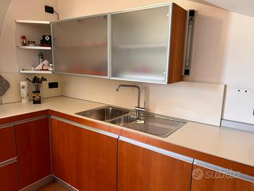 Cucina marca Valcucine modello Artematica in ciliegio composta da ante, cassetti,cestoni estraibili, cappa in vetro satinato curvo, lavello franke da 1mt, frigo Leibherr, forno Smeg, piano cottura 5 fuochi della A&G