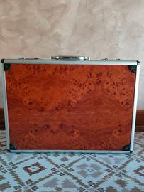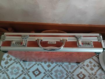 Elegante valigetta con coltelli, attrezzature e set di posate Von Meister. Molti attrezzi sono nuovi imbustati, qualcuno è stato usato (quelli senza rivestimento in foto). La valigia ha rivestimento interno in tessuto color crema e bordeaux e contiene due vassoi posizionati uno sull'altro. - Tasche elasticizzate per un'ottima organizzazione. - Chiusura con codice a scatto in metallo (codice 000) - Include tagliere in plastica bianca. - Vano imbottito per coltelli.