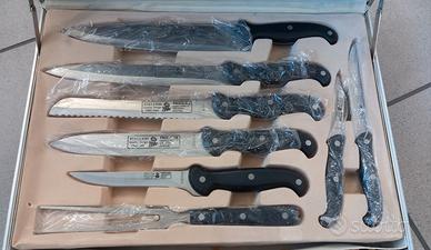 Valigetta metallica completa di: 8 coltelli per vari utilizzi 1 forchettone 2 forbici 1 acciaino