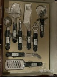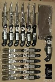 Valigetta contenente set coltelli. Contenuto: 6 coltelli da tavola 6 forchette da tavola 7 coltelli vari utilizzi 1 forchettone per arrosti 8 accassori ( cavatappi, sbuccia patate, ecc
