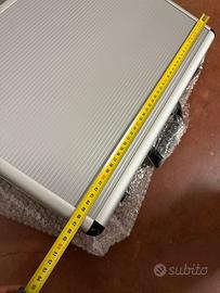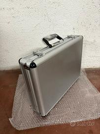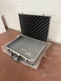 E’ in alluminio , con serratura, imbottiture antiurto e tasca interna.