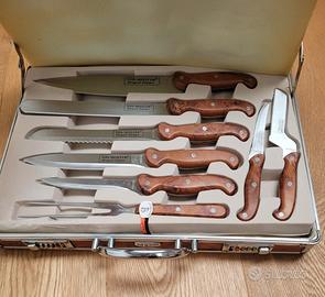Valigia set completo coltelli e posate per 6 persone in acciao inox Von Meister-integra in tutto, come da fotografie. Il set non è mai stato usato e i pezzi sono avvolti nella confezione di origine. Segnalo che la chiusura della valigia si discosta leggermente agli angoli, come in fotografia e che l'imballaggio interno è lievemente ingiallito nel perimetro. Il prezzo originario è pubblicato nella scheda tecnica a Euro 729,00.