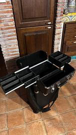 Trolley da truccatore piu scompartimenti e modulabile. Usato pochissimo in ottime condizioni. Altezza 60cm Larghezza 35,5cm Profondità 23 cm