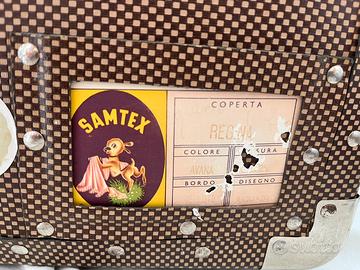 Valigia vintage marca Samtex anni 60… la valigia non presenti particolari danneggiamenti… cerniere e chiusure funzionanti… la rende particolare i paracolpi in alluminio.. ottimo come complemento d’arredo!!!dimensioni 55x21x42