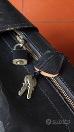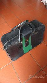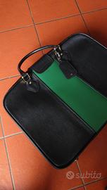 Iconica valigia da viaggio firmata FRANZI, storica maison di pelletteria milanese attiva dal 1864, famosa per la qualità artigianale dei suoi articoli in pelle. Questo pezzo risale agli anni ’70 ed è realizzato in vera pelle pieno fiore nera, con una distintiva fascia centrale in pelle verde e finiture in metallo dorato.