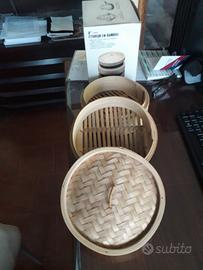 "Bamboo steamer/ Vaporiera", 8", 3 pezzi, D20cm e H14,5. Ideale per la cottura a vapore di verdure, legumi, carne e pesce. Mantiene il contenuto di vitamine. Utile anche per riscaldare il pane scongelato.
