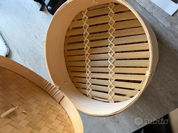 Vendo una vaporiera in bamboo ideale per cuocere al vapore verdure, ravioli, bao o dim sum, e un kit completo per preparare il sushi a casa.