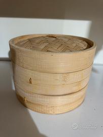 Vapiriera in bambù a due livelli dotata di un coperchio che misura 21 cm di diametro e 14 cm di altezza. Il design a due livelli offre una maggiore capacità, consentendo di cucinare più piatti contemporaneamente.