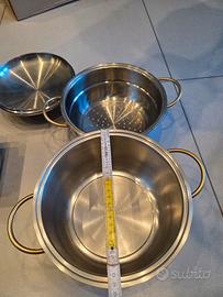 Vaporiera Pintinox in acciaio 18/10 made in Italy, con manici e pomolo in acciaio dorato.