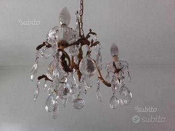 -1° Lampadario grande con pendagli, con montatura color bronzo (3 lampadine). Diametro 33,5 cm. Lunghezza lampadario 66cm. Prezzo 120e.
