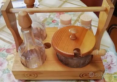 4 foto: set da 5 oliera-aceto-formaggio-sale -pepe in legno