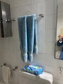 vasca bagno con seduta, mensola, specchio con luce, porta asciugamano, porta ospite e due ganci per accappatoii, wc, lavandino con rubinetteria inox, la cassetta del wc, doccia in vetro spesso e alluminio