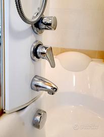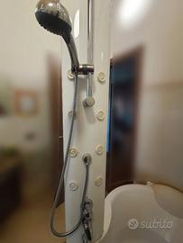 Vasca in resina con box doccia vetro temperato. Vedere foto per misure dettagliate. Completa di 8 soffioni verticali, rubinetteria, saliscendi e telefono doccia. Usata max 5 volte. Perfettamente lucida. Nessun segno di utilizzo. Full optional: comprende poggiatesta in schiuma, 4 mensole interne, attaccapanni esterno e porta chiusura box in cristallo. Possibilità d'installazione di sistema idromassaggio. Smontaggio e ritiro in loco a carico dell'acquirente. Fornito manuale molto completo per reinstallazione.