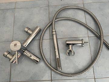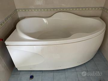 Vasca ad angolo con profilo arrotondato e doppio livello interno per permettere anche la posizione seduta in caso di necessità. Integra e funzionante, solo alcuni segni in basso dovuti al passaggio aspirapolvere. Dimensioni 160x90 cm. Smontata causa modifica locali. Disponibili anche alcuni accessori di cui verificarne la montabilità. Tutto come da foto.