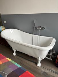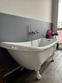 Vasca da bagno freestanding con piedini a zampa di leone in colore bianco e di scorta in colore argento, interno ed esterno smaltato.