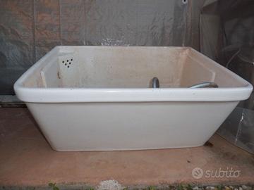 Vaschetta in ceramica per lavanderia con scarico troppo pieno di sicurezza completa di scarichi in plastica con siffone curvo miscelatore completo con pratico doccino possibilità di montaggio anche esterno