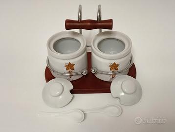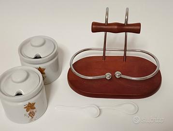 N. 2 VASETTI PORTASPEZIE O SALI CON COPERCHI E CUCCHIAI IN CERAMICA CON DECORAZIONE, CON SUPPORTO IN METALLO CROMATO E LEGNO, NUOVI MAI USATI.
