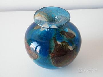 Piccolo vaso dalle forme totalmente arrotondate, in pasta di vetro marmorizzata di Murano. Di colore blu cobalto con infusioni ambra, grigie, verdi d'ispirazione etrusca. Molto lucido e brillante (non facile da fotografare!).