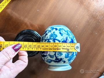 Grazioso vasetto in porcellana in stile classico orientale (Blue and White), decorato con motivi floreali blu su fondo bianco, completo di base.