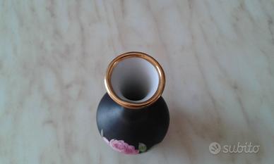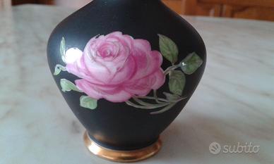 Bellissimo Vasetto dipinto a mano, marchiato JK Decor Carlsbad Bavaria, di colore nero con dipinta una rosa di colore rosa.