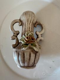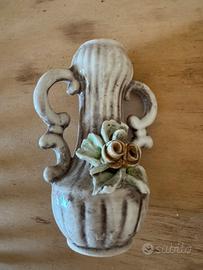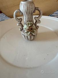 Vasetto poracandela in porcellana smaltato con manici ed elemento floreale applicato .