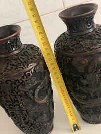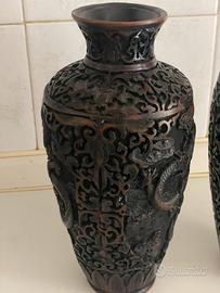 , Antichi vasi cinesi intagliati a mano in cinabro nero, vasi in stile urna intagliato elegante d'epoca in cinabro, vaso intagliato con decoro cineseria d'epoca.