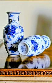 coppia di vasi cinesi in porcellana decorati in blu ,bianco e oro a motivi floreali. Sono oggetti decorativi versatili, adatti sia a contenere piccole composizioni floreali che ad essere esposti come arredo. Altezza cm.18.