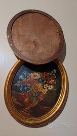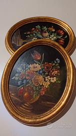 Coppia 2 quadri ovali dipinti vasi di fiori olio su tavola con cornice dorati. misura 28x34 cm