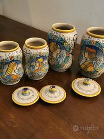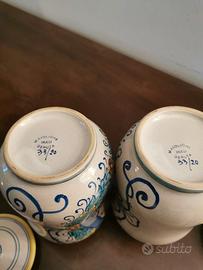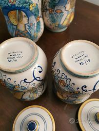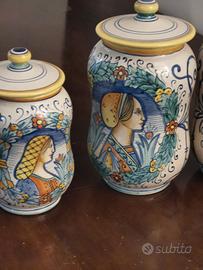 Questi oggetti sono vasi da farmacia in ceramica, spesso chiamati albarelli, realizzati nello stile tradizionale della maiolica di Deruta. I vasi presentano elementi classici della produzione artigianale umbra: Decoro "Bella": ritraggono profili rinascimentali di dame e cavalieri, un tema tipico delle "coppe amatorie" del XVI secolo. Stile Deruta: i colori predominanti sono il giallo ocra, il blu cobalto e il verde ramina su fondo bianco. Funzione: storicamente usati nelle spezierie per conservare erbe medicinali e composti. I vasi sono integri, senza alcun difetto, una coppia un'altezza maggiore rispetto all'altra con dama e cavaliere. Sono stati decorati da Maioliche Nulli Deruta (Umbria), sono oggetti preziosi in edizione limitata, unici perché decorati a mano. Anni 70 circa. Vasi più grandi: H 16 cm, diametro 8 cm, L Max 12 cm. Vasi più piccoli : H 13 cm, diametro 7 cm, L Max 9 cm. Rarissimi, Per appassionati e per un arredamento unico.
