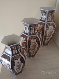 DESCRIZIONE DEL SET: Il set comprende tre vasi di dimensioni graduali più un'elegante zuccheriera ornamentale con coperchio decorativo, tutti caratterizzati dallo stesso raffinato motivo ornamentale in stile orientaleggiante. Le decorazioni presentano colori intensi – blu cobalto, rosso bordeaux e dettagli dorati – con pregiati motivi floreali che impreziosiscono ogni pezzo.