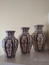 DESCRIZIONE DEL SET: Il set comprende tre vasi di dimensioni graduali più un'elegante zuccheriera ornamentale con coperchio decorativo, tutti caratterizzati dallo stesso raffinato motivo ornamentale in stile orientaleggiante. Le decorazioni presentano colori intensi – blu cobalto, rosso bordeaux e dettagli dorati – con pregiati motivi floreali che impreziosiscono ogni pezzo.