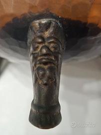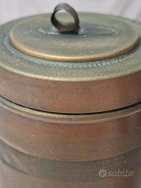 Collezione contenitori portafiori o semplicemente oggetti arredo vintage in rame inciso o martellato con particolari evidenziati in foto sulle tre gambe di un vaso.