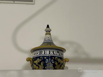 Proponiamo un raffinato set composto da 5 vasi da farmacia in ceramica. Oggetti di grande fascino, decorati a mano con motivi floreali e scritte latine originali. Ideali per collezionisti, arredatori o amanti dello stile vintage.
