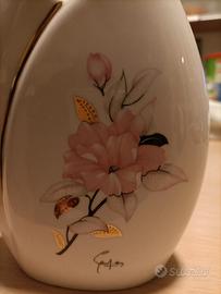 2 vasi, finemente decorati con motivi floreali, rosa e oro. Dimensioni: h.15 cm, larghezza ¹ cm e profondità circa 5 cm. Ceramica made in Italy
