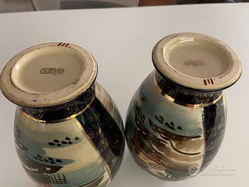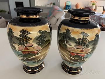 Coppia di vasi Giapponesi Stasuma antichi decorati a mano con rifiniture d oro raffiguranti scene di vita e paesaggio.