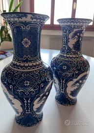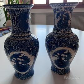 Vendo una coppia di vasi classici ed eleganti, in ceramica di Delft, come indicato dal marchio sul fondo. Sono caratterizzati dalla tipica decorazione bianca e blu, raffigurante paesaggi olandesi con mulini a vento. Si tratta di oggetti da collezione, molto popolari in Europa tra il 1600 e il 1800. Dimensioni: altezza 30 cm - diametro alla base 9 cm - diametro massimo 14 cm - diametro dell’imboccatura 11 cm - peso 915 g. Spedizione possibile, con spese a carico dell’acquirente.
