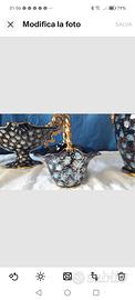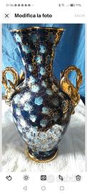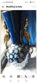 - N. 2 Vasi in ceramica decorati con motivi floreali di colore blu e petali celesti legati insieme da un sottilissimo filo molto dorato, tanto da conferirgli una lucentezza meravigliosa, inoltre come manici sono raffigurati in oro nel primo vaso più grande due coccodrilli e nel secondo vaso due cigni; Misure Vaso più grande 11x18x38 cm; il secondo 9x18x30 cm.