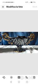 - N. 1 Alzatina, centro tavolo dello stesso colore e motivi dei due vasi prima illustrati, di forma ovale alle due estremità presenta due draghi in oro. Misure: Base ovale larghezza 13,50 cm - min 10 cm; altezza 18 cm - min 15: ovale superiore larghezza max 25 cm - min 17 cm.(sulla base una leggera scheggiatura).