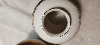 Coppia di vasi vintage in porcellana tedesca. Prodotti da Royal Porzelan Bavaria. Alti 14 cm, circonferenza maggiore 38 cm. Hanno luminoso decoro oro. In ottime condizioni, solo un vaso ha una piccola imperfezione alla bocca, come da ultima foto.
