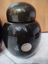 Due manufatti che sembrano essere vasi o urne decorative e sono caratterizzate da una finitura lucida nera con iridescenze oro realizzati dal maestro Carlo Moretti,mastro vetraio di Murano, corredati di certificato n 173319,uno alto circa 21 cm con diametro di 15 cm circa e l'altro 17 cm di altezza e 12 cm di diametro.