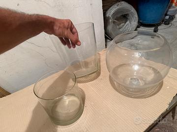 Vendo tre vasi in vetro di diverse forme e dimensioni, adatti sia per l’allestimento di piccoli acquari che per terrari, piante grasse o usi decorativi.