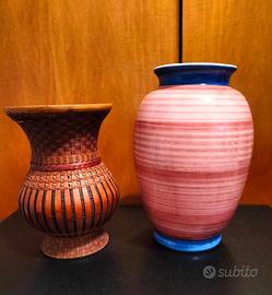 Eleganti vasi da tavolo, perfetti per aggiungere un tocco di stile alla tua casa. Questo set include un vaso in vimini intrecciato e un vaso in ceramica con un design a righe. Il vaso in vimini presenta finiture naturali. Il vaso in ceramica è decorato con sfumature rosa e dettagli blu.