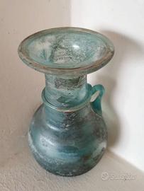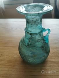 _1 vaso di un delicato colore turchese celeste, credo sia trattato per ottenere una superficie corrosa e anticata, ottenuta suppongo con il metodo scavo a Murano. La base, levigata porta la cicatrice del pontile.